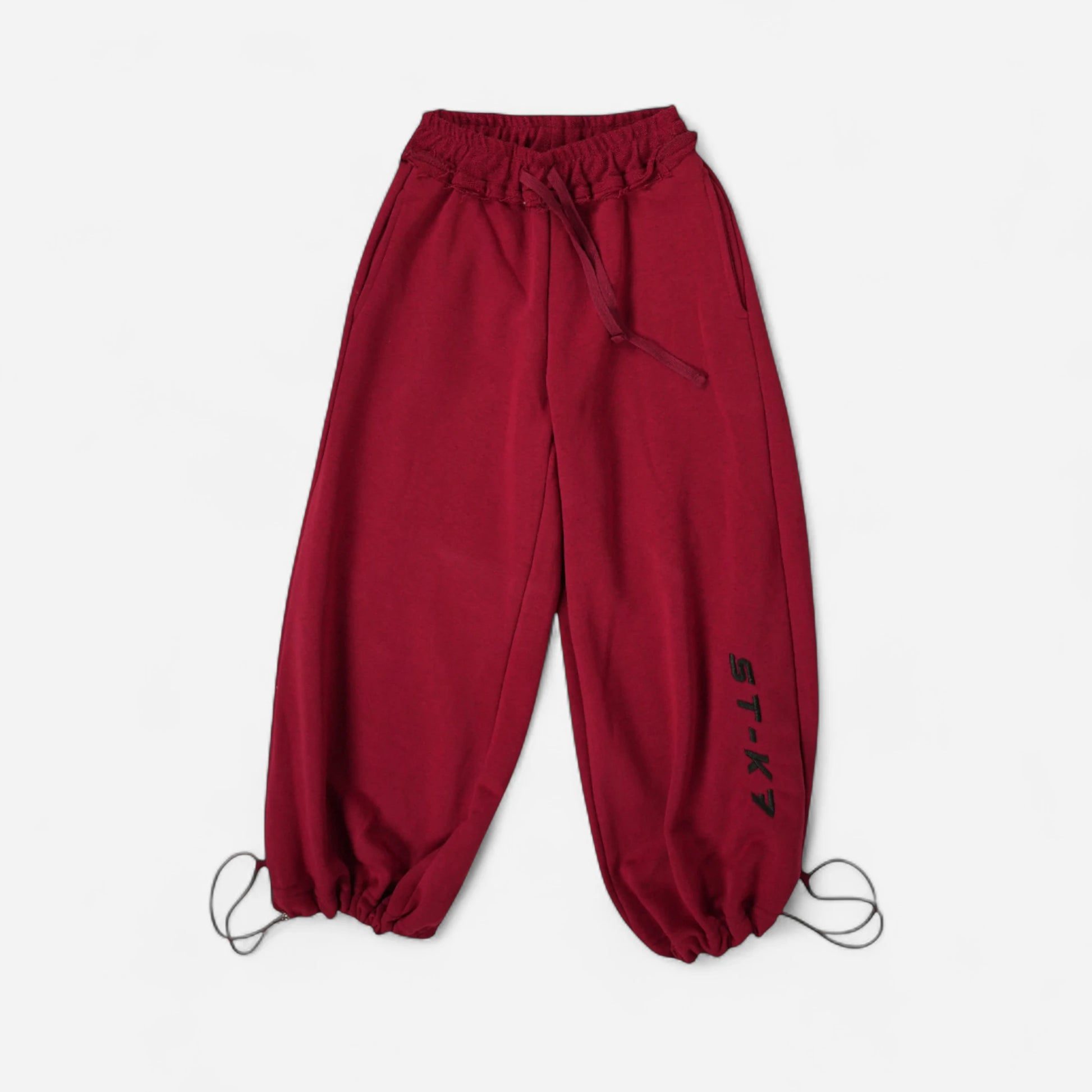 Bordo rengiyle sıcak ve güçlü bir görünüm sunar; dikey ST-K7 nakışı ve paçalardaki charm büzgü detaylarıyla özgün bir karakter yaratır