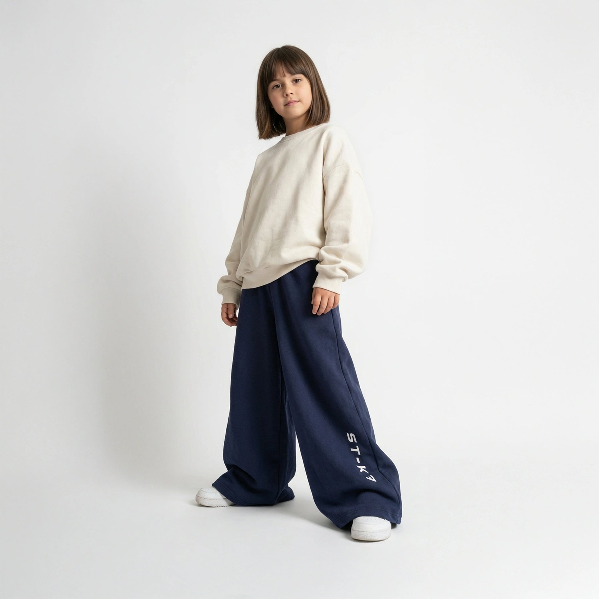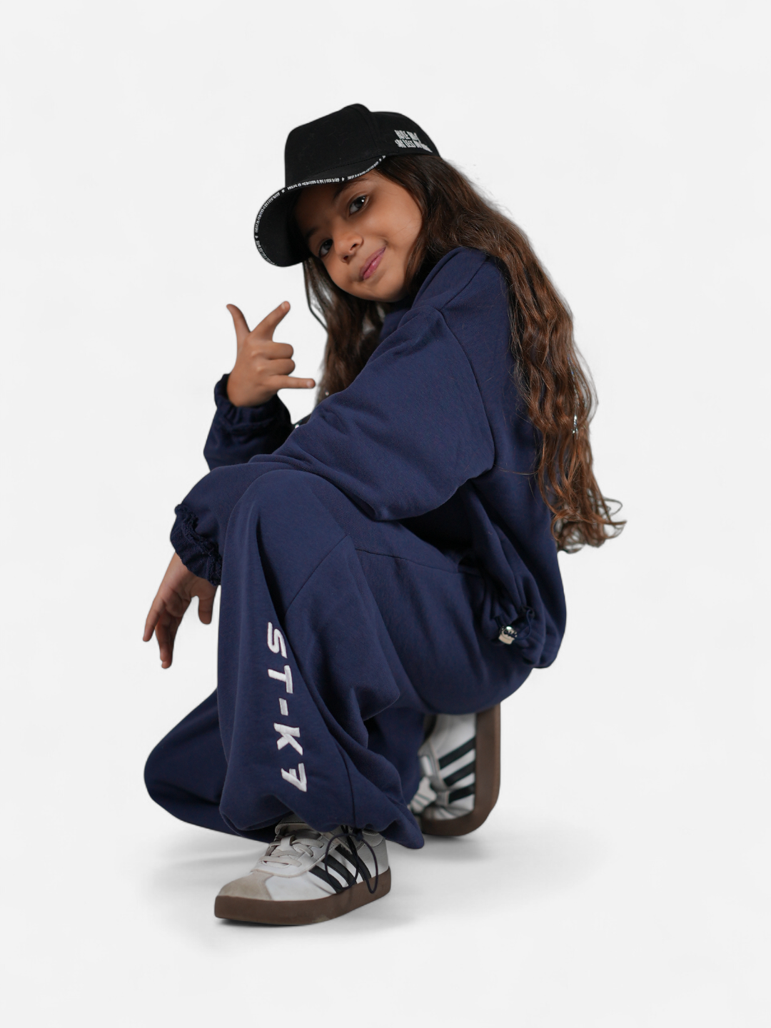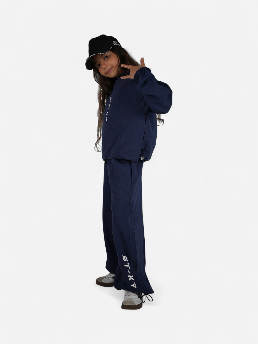 Lacivert tonuyla güçlü bir duruş sunar; dikey ST-K7 nakışı ve paçalardaki charm büzgü detaylarıyla karakter kazanır.