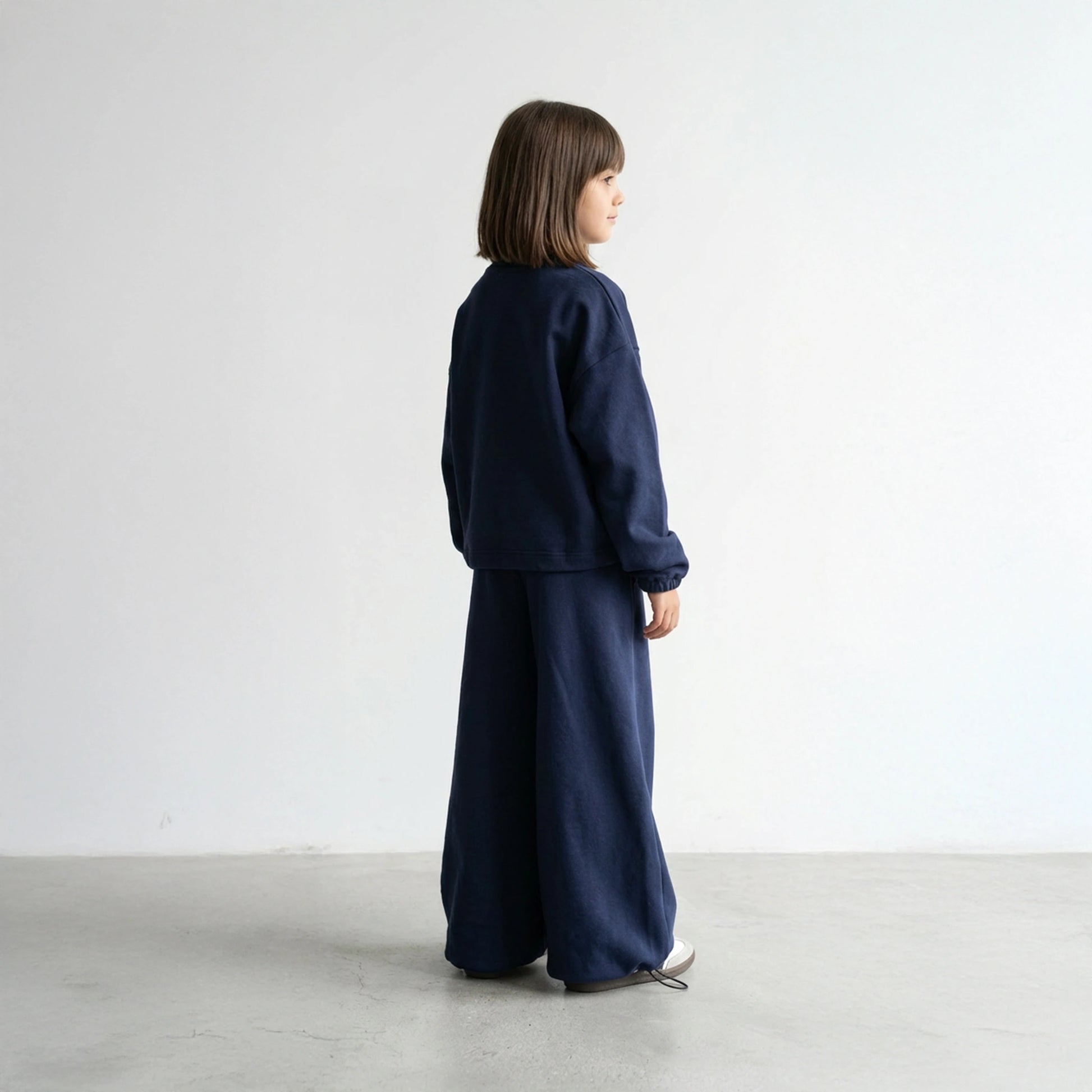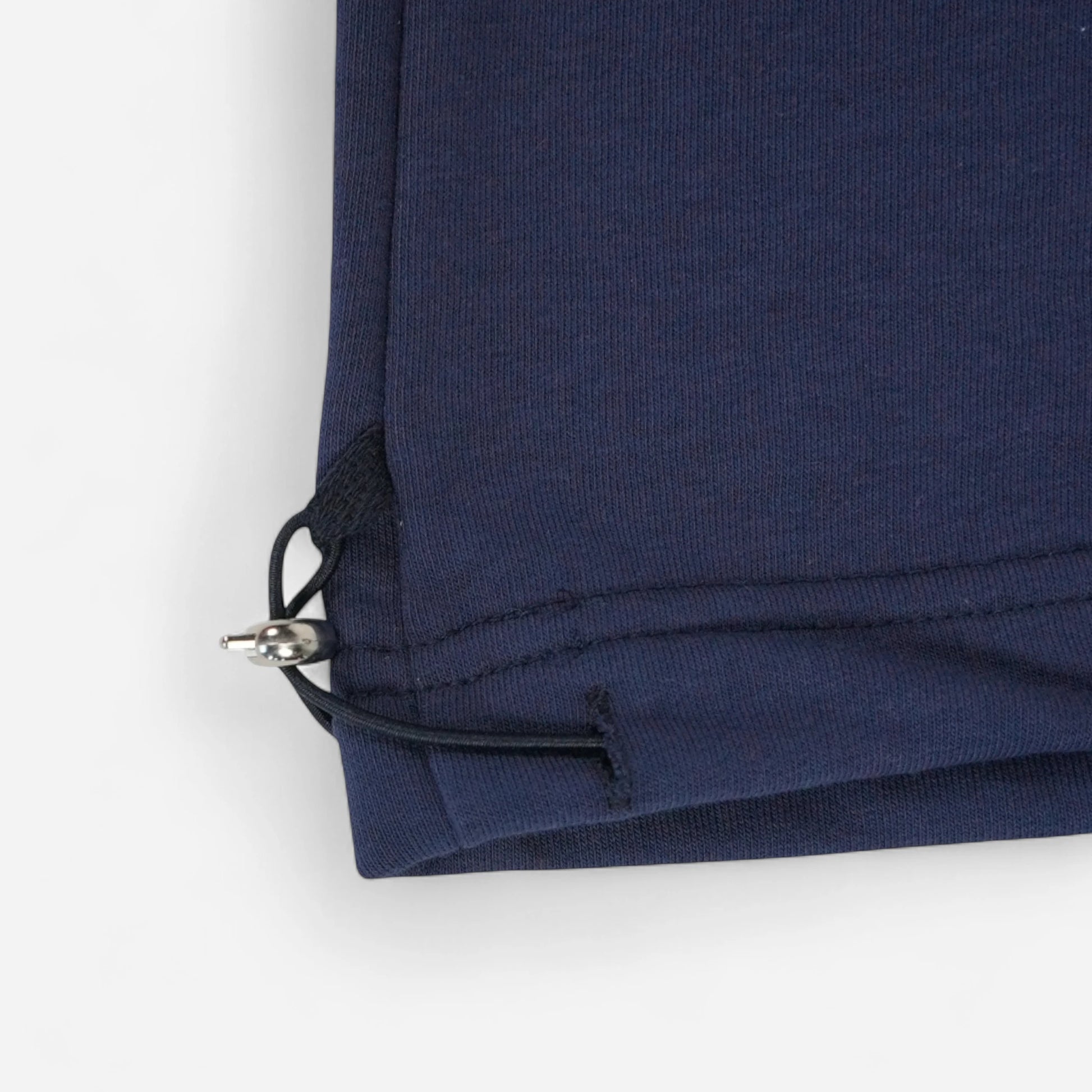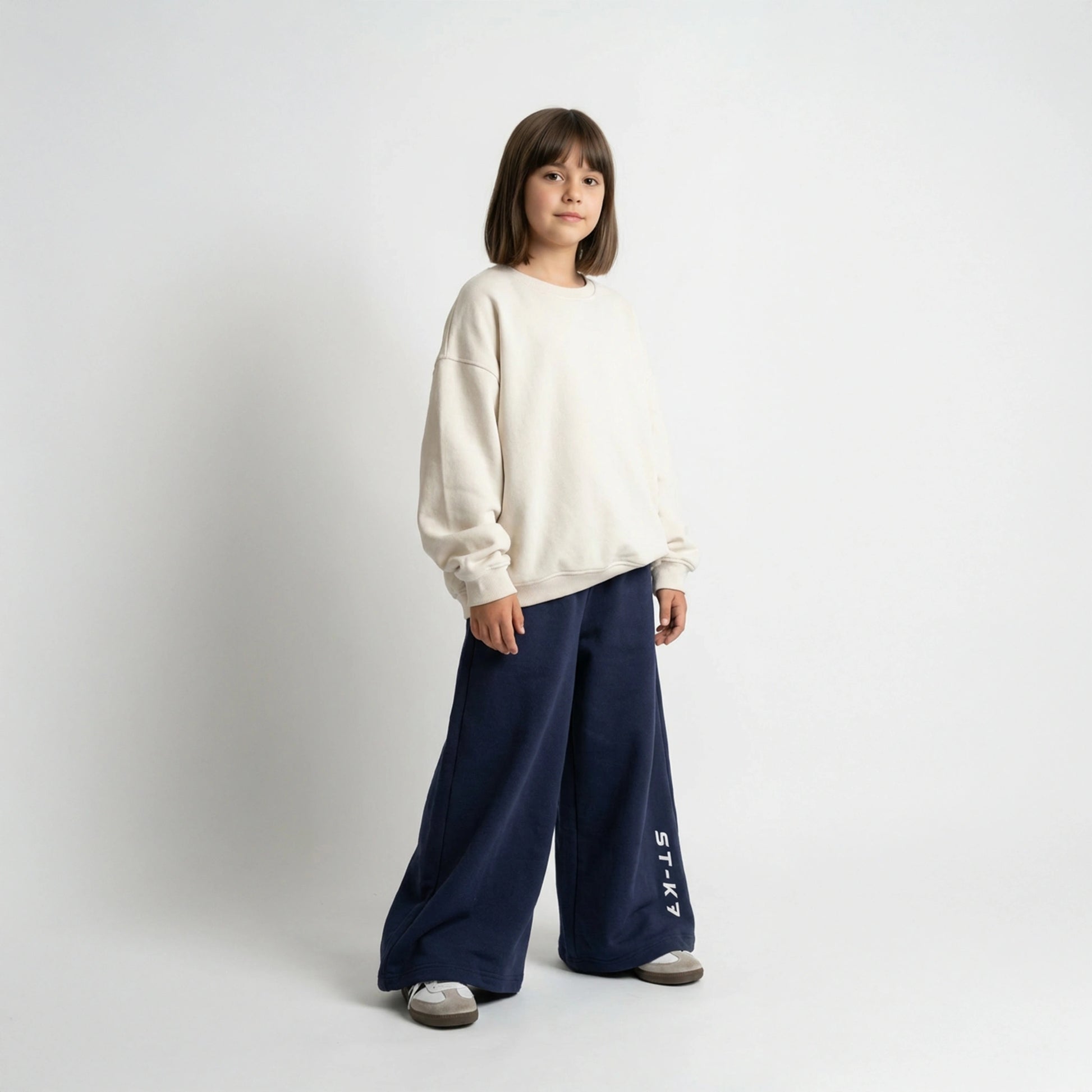 Lacivert tonuyla güçlü bir duruş sunar; dikey ST-K7 nakışı ve paçalardaki charm büzgü detaylarıyla karakter kazanır.