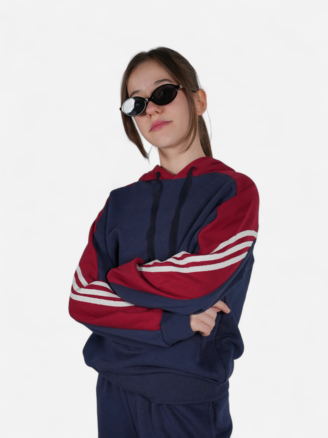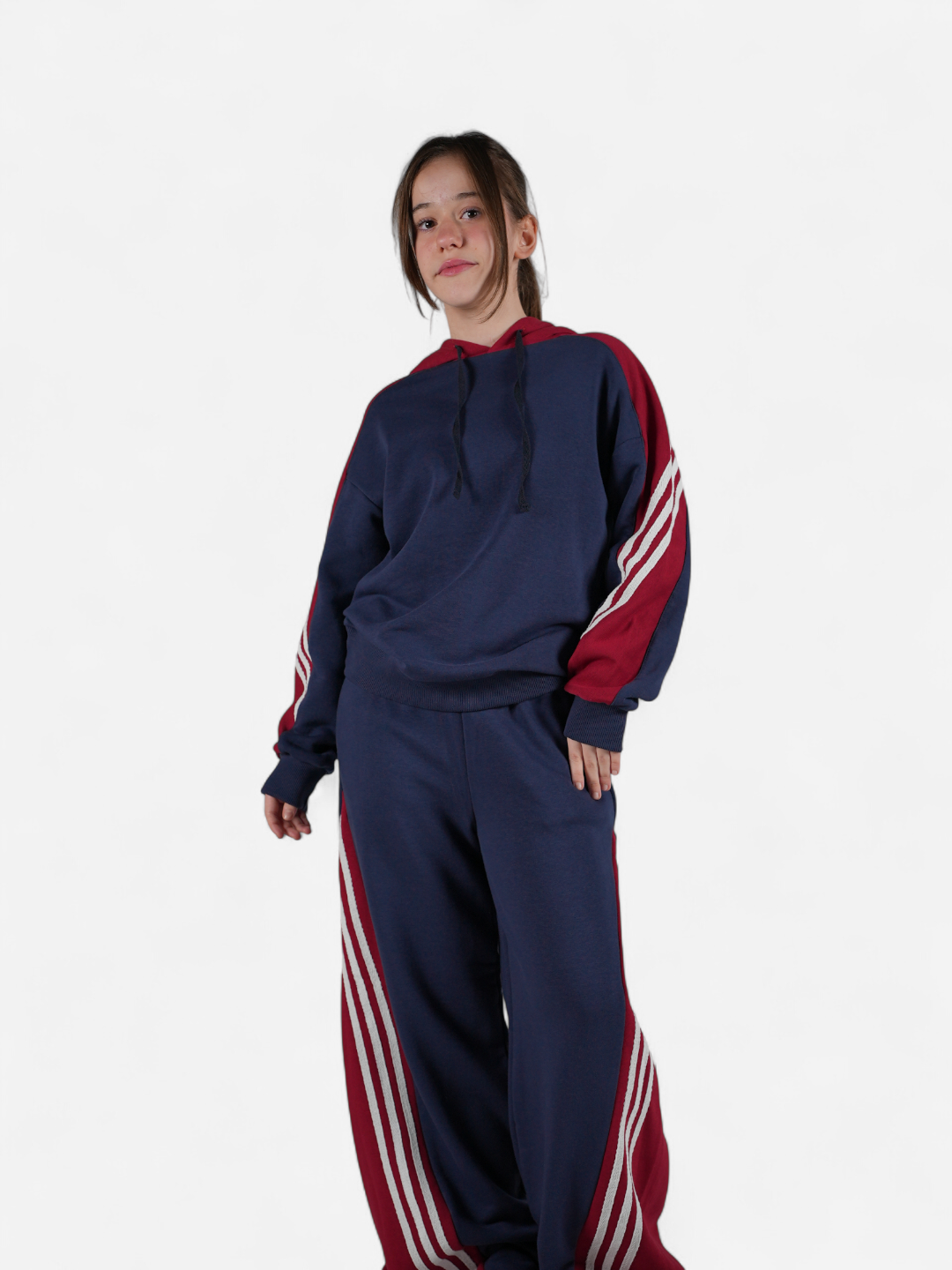 Oversize hoodie kesimiyle rahat, şehirli ve özgür bir görünüm sunar.